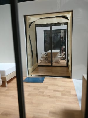 連結方法は耐候性のある布地を使って、オーニング(テラス時の屋根)と連結壁を切り替えます(写真・動画参照)