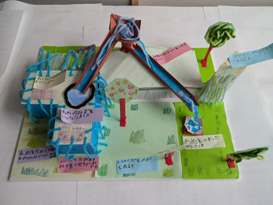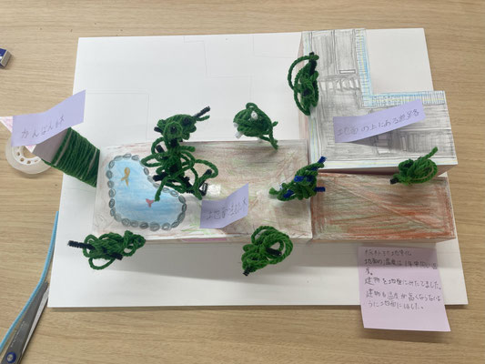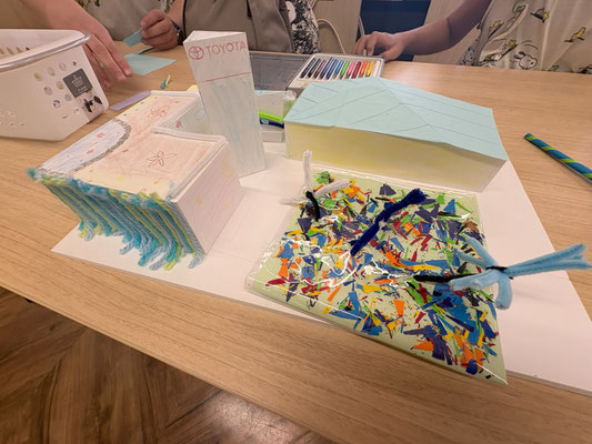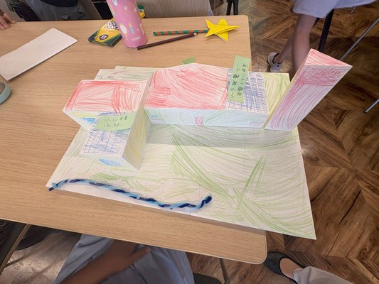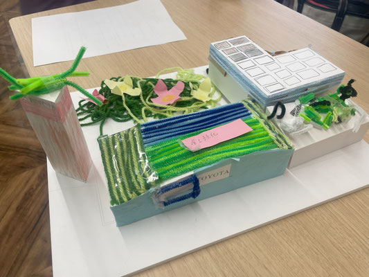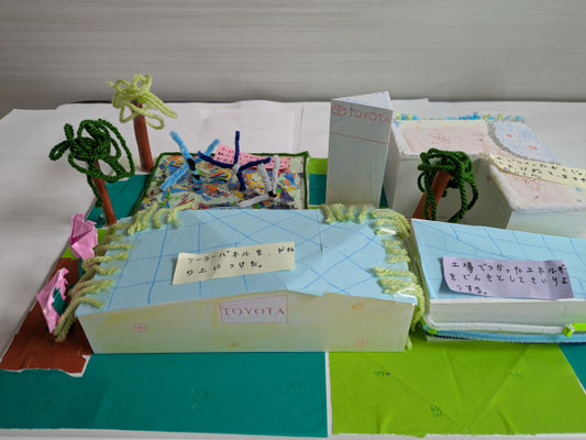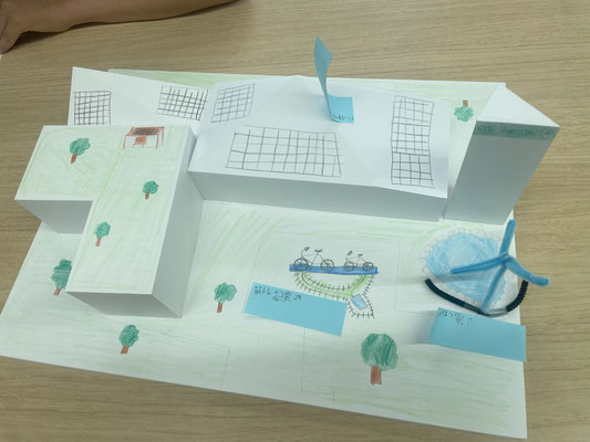 「屋上緑化」や「太陽光パネル」などコメントが書かれているのを見ると、なにか環境を意識したイベントだったのでしょう。子供たちの自由な発想が模型にカラフルに現れて、とても明るく楽しい作品になりましたね。